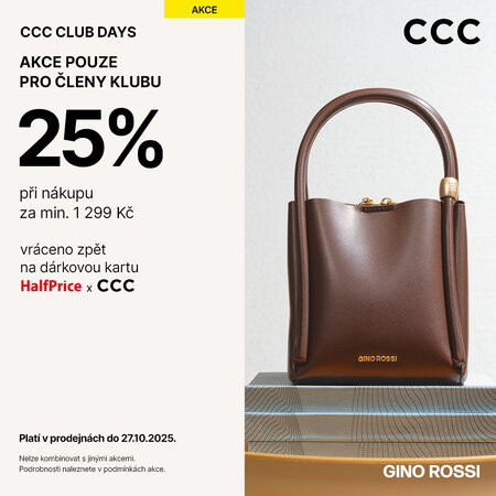 CCC Club DAYS jsou tu! Členové Klubu získají 25 % zpět na dárkovou kartu CCC x HalfPrice při nákupu za min. 1299 Kč! Vyberte si ze stovek modelů známých značek a nakupte si nejnovější trendy! Využijte tuto výjimečnou nabídku! CCC Club DAYS trvají pouze do 27.10.2025 v prodejnách CCC. Nenechte si je ujít!
