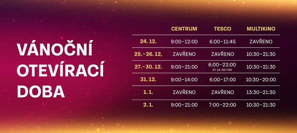 • Tesco: 6:00–22:00 (27. 12. otevíráme od 7:00)