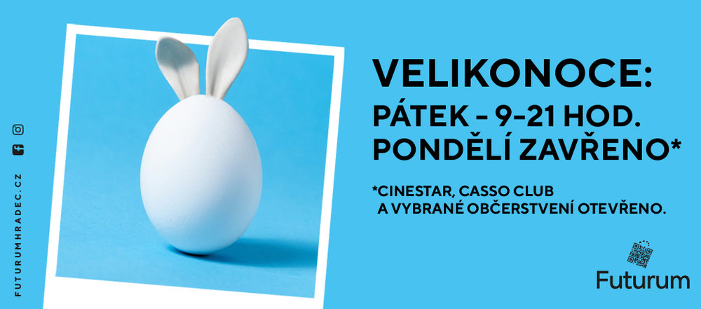 Budeme tu pro vás v pátek v klasické otevírací době, 9:00 - 21:00. Jen v pondělí budeme mít zavřeno, vyjma multikina Cinestar, herně Casso Club a vybranému občerstvení.